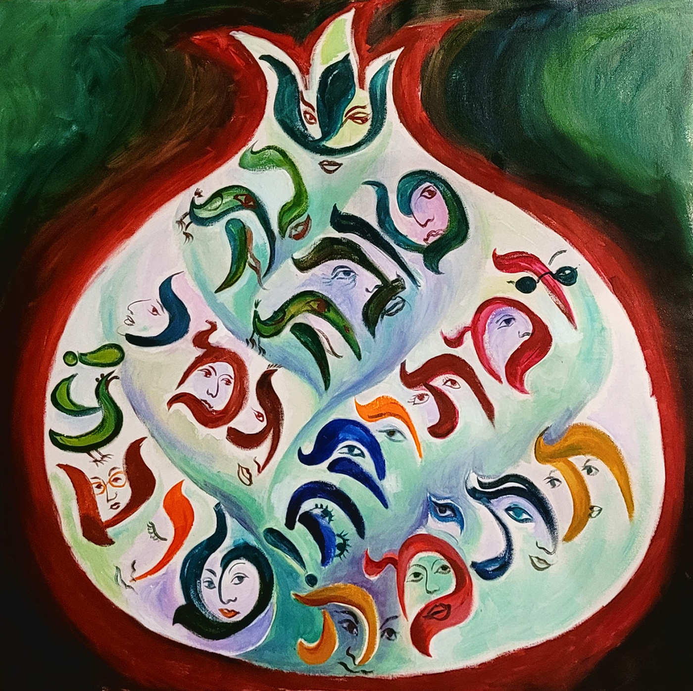 Dieses Gemälde zeigt auf dekorative Weise eine Granatapfelfrucht, in deren Inneren auf Hebräisch Grüße zum jüdischen Neujahr und Wünsche für gute Sätze im Buch des Lebens zum Fest Jom Kippur geschrieben sind. Glückwunschbriefe stilisiert unter Granatapfelkernen. Jeder Buchstabe hat eine Form, die einem menschlichen Gesicht ähnelt. Gemeinsam bilden sie eine kleine Gemeinschaft. Die Gesichter werden als Karikaturen dargestellt, sie lachen sich aus, zwinkern, Grimassen bauen.