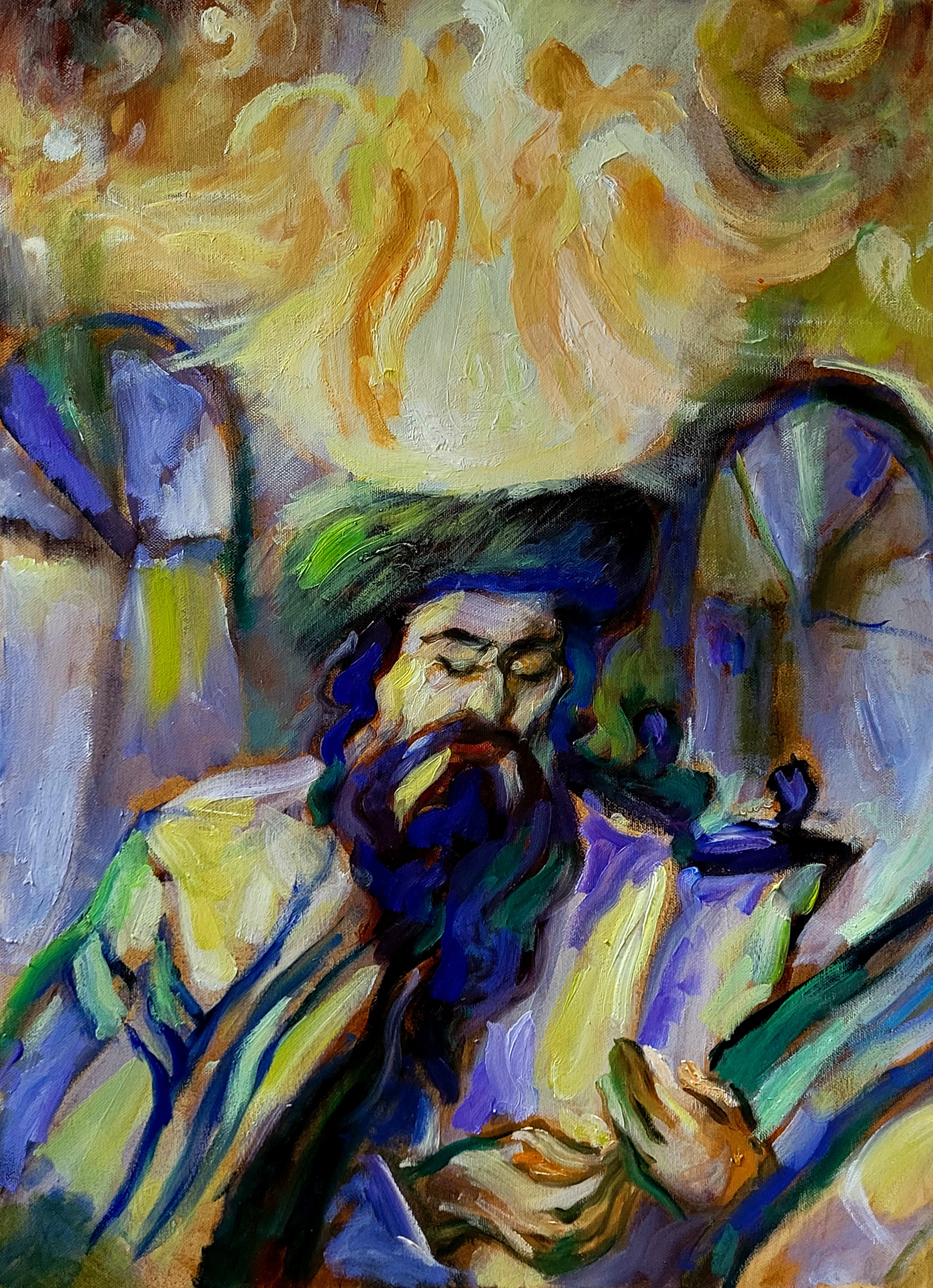 Auf dem Gemälde sehen wir einen Rabbiner, der eine Torarolle in der Hand hält. Er ist in Gebete versunken, über seinem Kopf sehen wir einen hellen Heiligenschein, in ihm sind einige vage Bilder zu erkennen. Dieses Bild wurde zu einer Illustration des Gedichts der Dichterin Victoria Levina (Israel), das aus dem Zyklus „Tiberische Chroniken“ „Jüdisches Tiberias“ genannt wird. Dieser Zyklus wurde Teil der 2023 bei Stella Verlag (Hechingen) erschienenen Gedichtsammlung „Wanderung nach Jerusalem“. Inessa Rozenfeld war die Illustratorin dieser Sammlung.