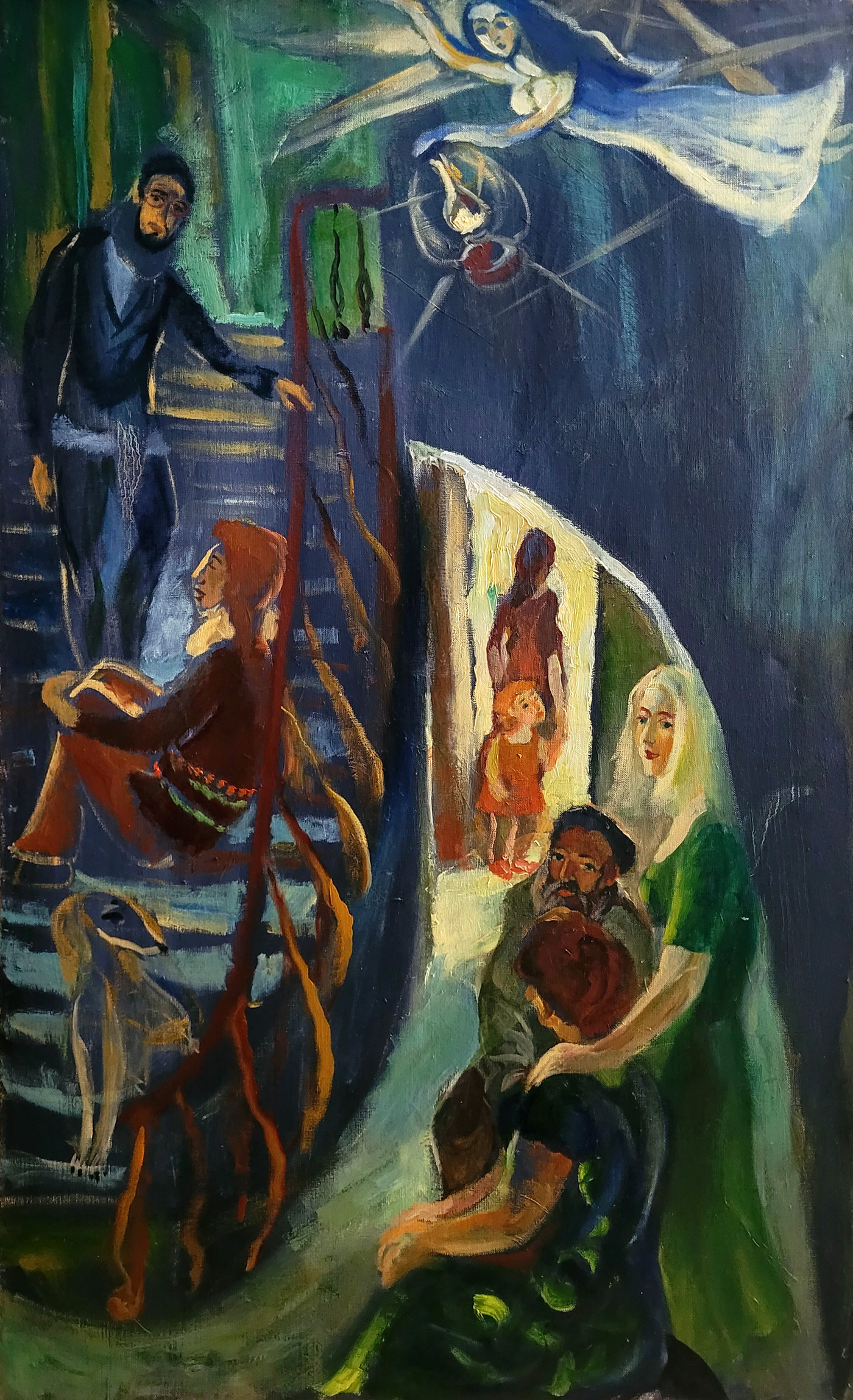 Dieses Gemälde zeigt die Treppe eines Hochhauses in einem Viertel von Tel Aviv. Auf der Treppenhaus stehen die Bewohner dieses Hauses, sie kamen aus den Ländern der ehemaligen Soviet Union. Oben auf der Treppe sehen wir einen jungen Mann und eine junge Frau sitzen. Unten rechts sehen wir eine junge Frau, die ihre Eltern umarmt, Menschen mittleren Alters, die auf Stühlen im Flur sitzen. Ein Mädchen mit ihrem kleinen Bruder im Hintergrund unten schaut durch eine offene Tür aus dem Eingang. Alle diese Nachbarn versammelten sich im Eingang, um sich vor den Raketen zu retten, die auf die Stadt flogen. Tel Aviv war wie andere Städte Israels im Gazastreifen wiederholt schwerem Waffenbeschuss ausgesetzt.