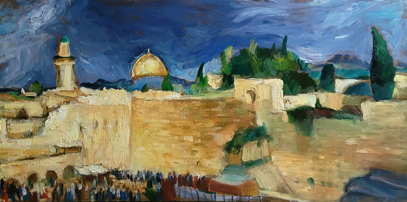 На картине изображен вид Иерусалима, охватывающий площадь перед «Стеной плача», главной святыней в иудаизме.
